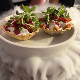 • Duck Masala Fry: Duck masala fry, chives in a mini kulcha taco