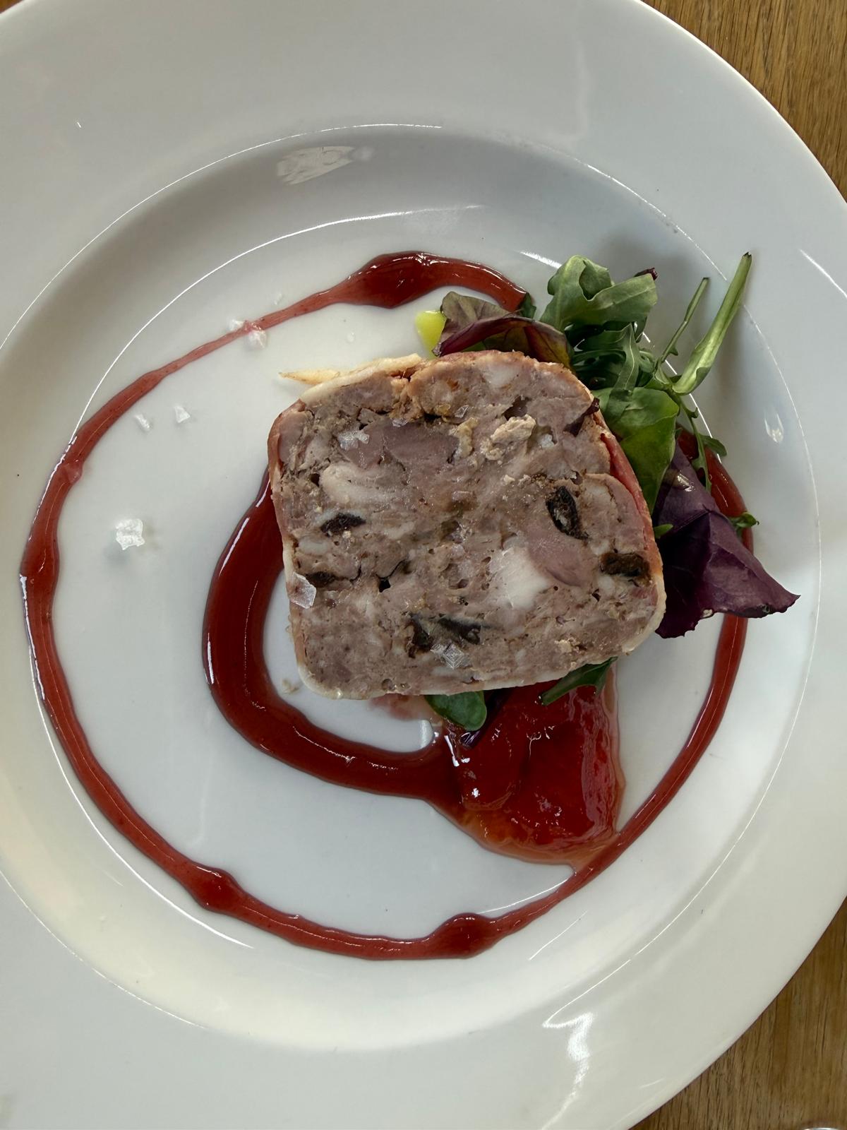 Cheshire game terrine was served as our starter. It had deep flavour and the addition of the prunes added a sweet earthy note balancing the flavours of the rabbit and pheasant. The crab apple jelly added a tangy contrast, a classic pairing for the game cutting through the richness of the terrine. The homemade bread was soft, airy and utterly divine. The beautiful golden salty crust, dimpled with little pockets of air, and infused with olive oil was just "chef's kiss”. The starter was accompanied by Wild House chardonnay. It had a fresh nose, citrus fruits and a subtle hint of oak. It was bold enough to stand up to the terrine.